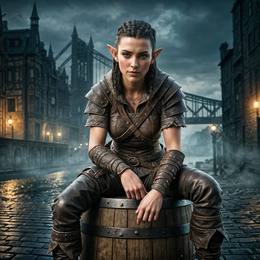 A cinematic film still of a mysterious female elf bandit scout, adorned in leather armor, sitting on a barrel amidst the dark, atmospheric backdrop of a medieval city docks, with rich detail and cinematic lighting.