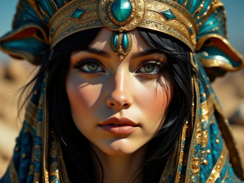 This lomography image captures an Egyptian priestess invoking pagan gods with detailed skin and intricate textures. The scene features vibrant colors, sharp focus, and deep contrast for a high-definition, emotional portrayal.