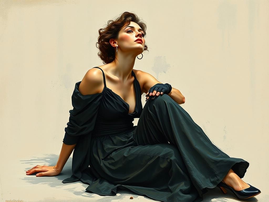 This image shows a despondent woman seated and gazing upwards. The artwork has thick brushstrokes and watercolor textures, resembling an impressionist painting with gouache and impasto techniques.