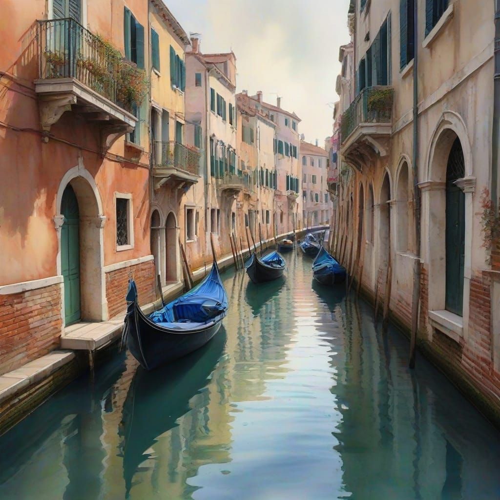 A dreamy Venetian canal at twilight, with liquid watercolor canals in sapphire and emerald. Intricate buildings glow softly, creating a romantic and mesmerizing scene.