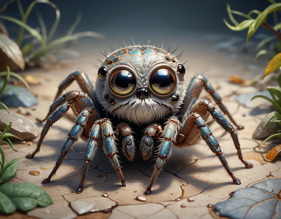 A vibrant digital image of an adorable, six-eyed baby spider with large cartoon eyes, rendered in a detailed, colorful style with volumetric lighting. Evokes a Ghibli-esque aesthetic.