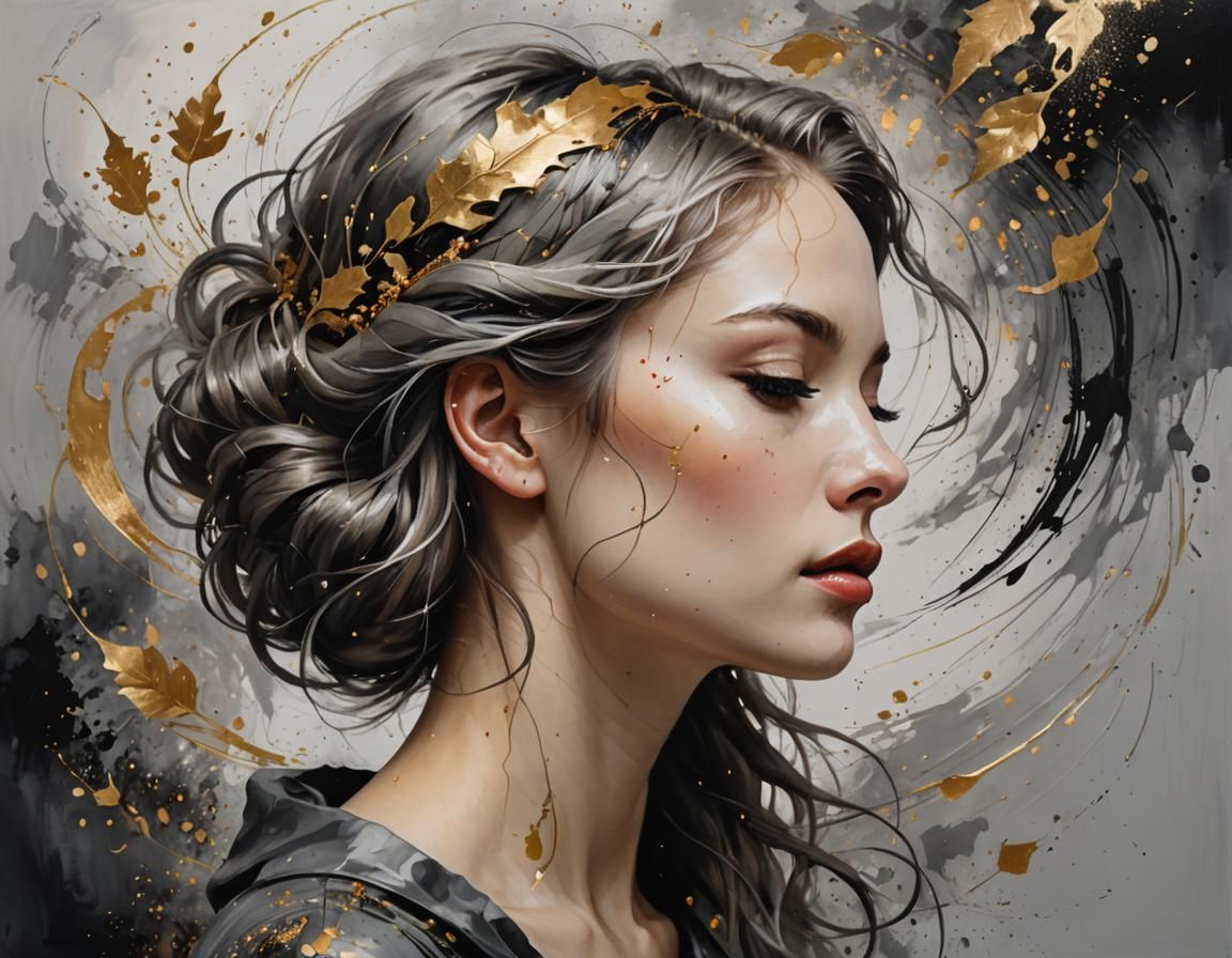 This striking image shows a photorealistic woman in profile, with abstract gold, black, and gray tones swirling around her. Created with a mixed media style, it features expressive brushstrokes and a dreamy quality.