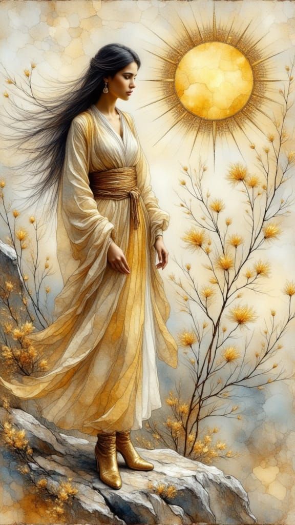 This image shows a contemplative woman with long black hair, wearing a tan robe and gold boots, standing on a rocky ledge with floral elements. Rendered in a soft, dreamy watercolor style with muted colors.