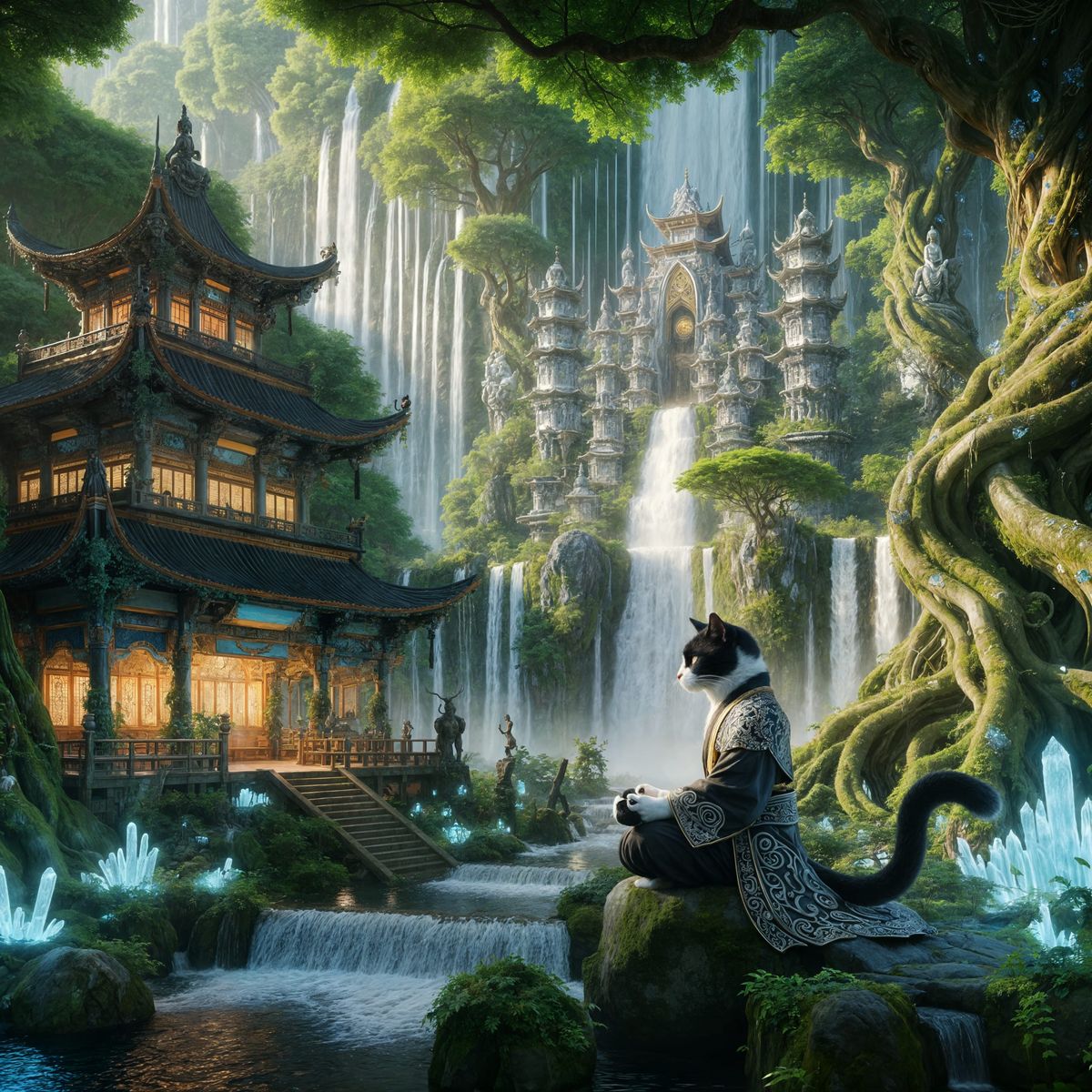 This is absolutely mesmerizing! 🌊🐈 The waterfalls, temples, and the meditating cat together create such a serene, magical world — pure tranquility in motion.✨🍃