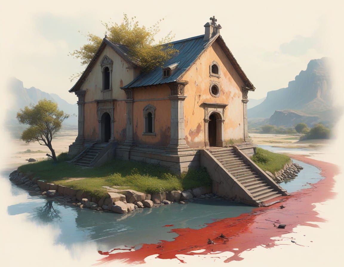 This oil on canvas artwork depicts a Roman citizen in a coliseum, their blood on the sand. Vibrant color splashes symbolize life's fleeting nature.