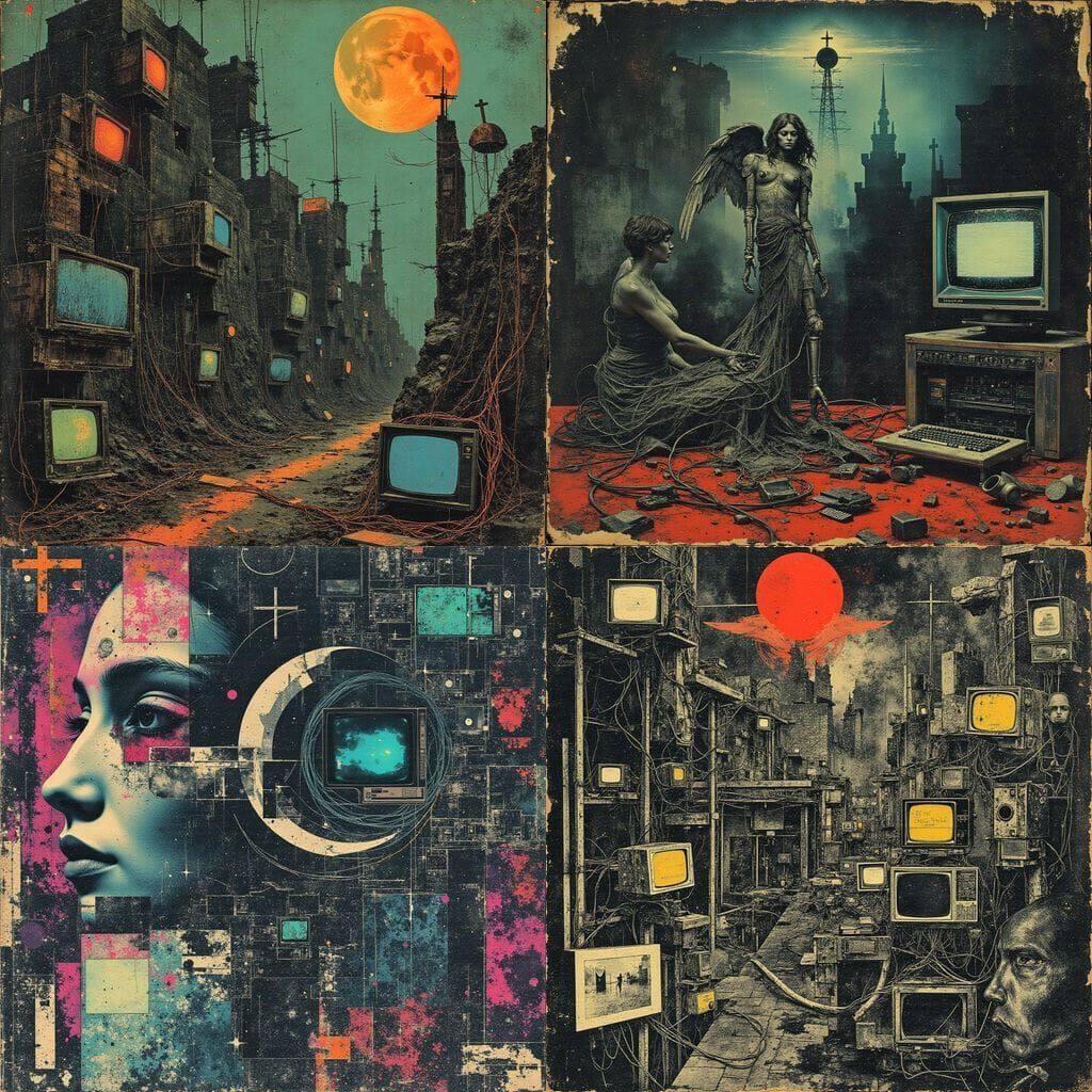 This image explores the intersection of technology and divinity, featuring angelic figures integrated with retro computer hardware, wires, and screens, symbolizing the comparison between divine and technological creation.