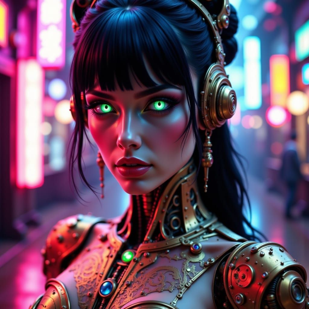 A striking picture of a cyberpunk robot woman with a porcelain face in a neon nightclub. She wears a Victorian gold dress with lace and gears, enhanced by dramatic, retro-futuristic lighting.