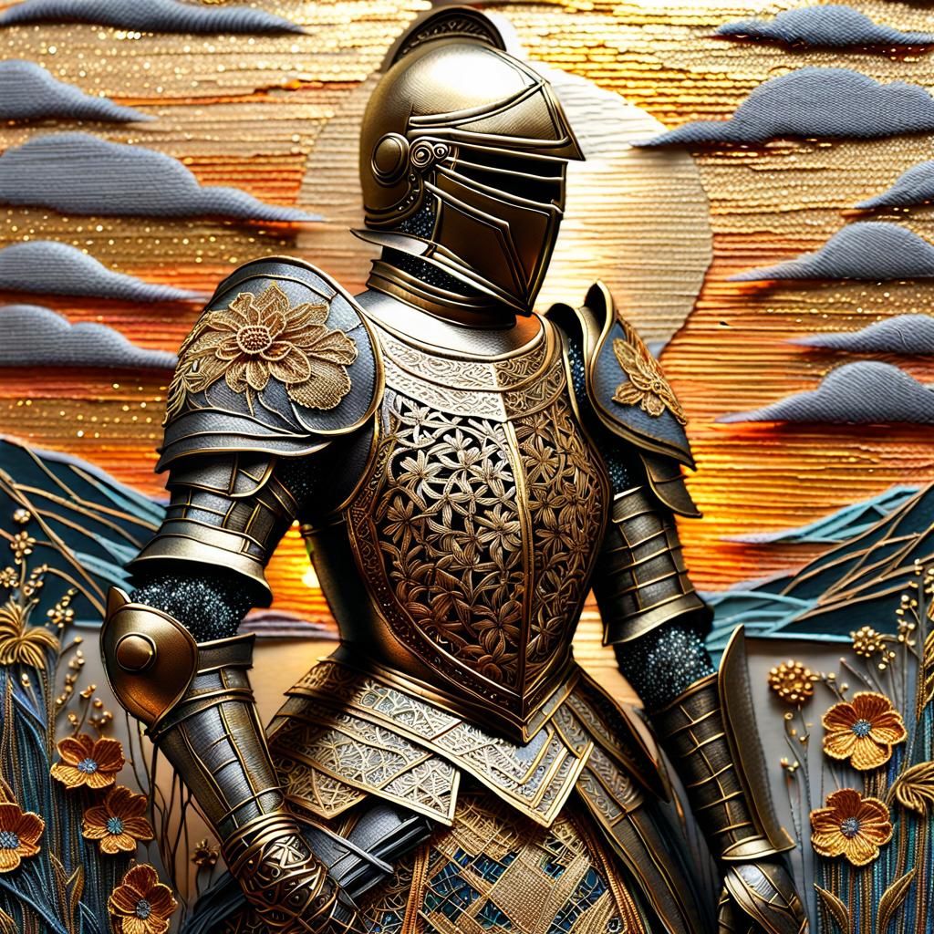 A close-up image of a girl knight in golden armor. The sunset scene is an embroidery art made of glittery metal thread and yarn, with floral patterns and surrealist sunrays.