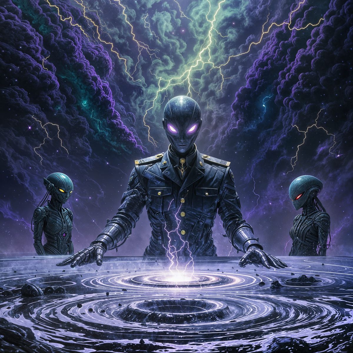 A striking picture of three alien races holding a tribunal for a biomechanical shadow person. The figure has glowing purple eyes and wears a military uniform. The scene is rendered with a surreal, fractal aesthetic.