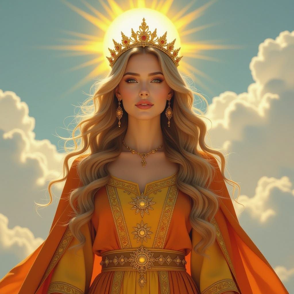 A radiant woman with long blonde hair wearing a sunburst crown and golden dress hovers in the sky. This captivating digital painting features intricate details, deep colors, and divine atmospheric lighting.