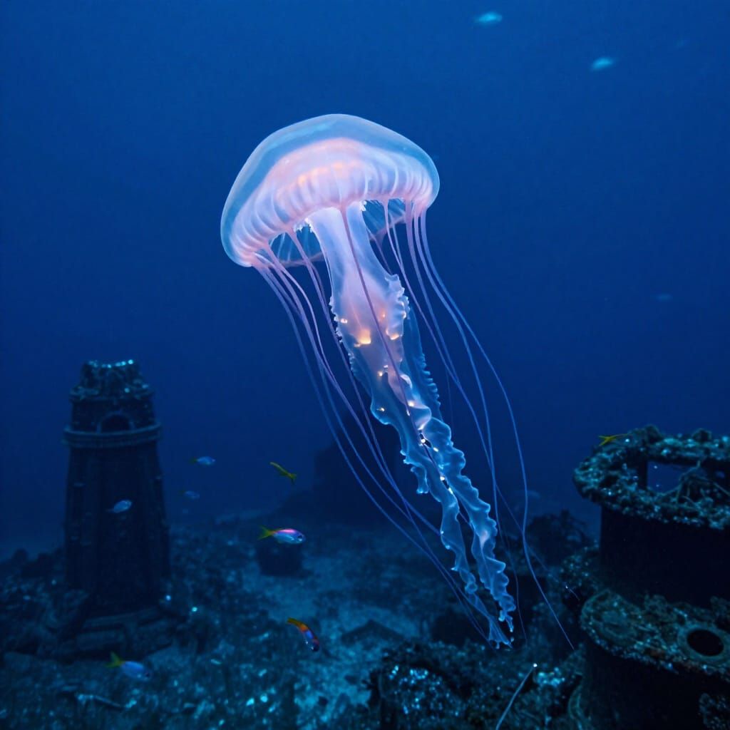 This image shows a majestic bioluminescent jellyfish illuminating ancient underwater ruins in a deep alien ocean. Tiny fish swim around the surreal scene, captured in hyperrealistic underwater photography.