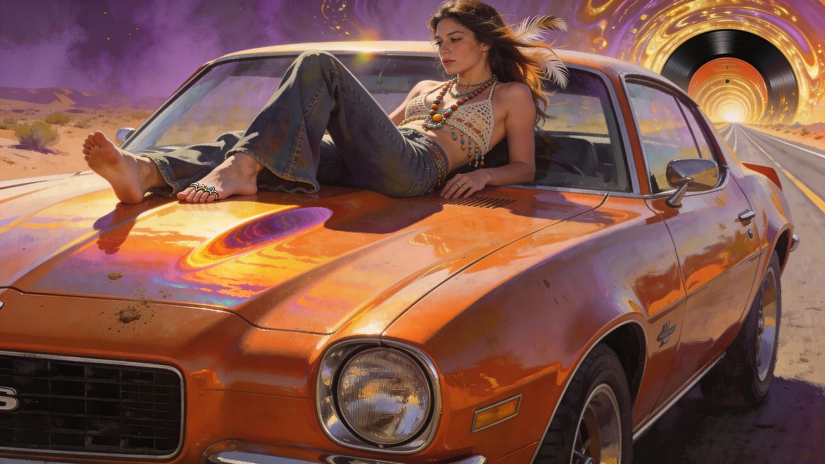 A hyperrealistic digital painting of a barefoot woman in 70s bohemian style lounging on a metallic orange 1973 Camaro against a psychedelic desert sunset. Cinematic splash art.
