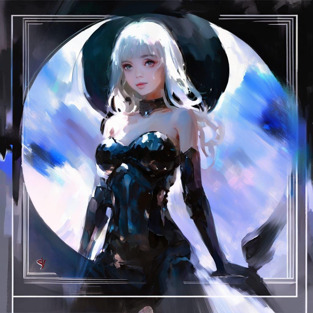 This image shows a woman with anime-inspired features, set against a soft impressionist background, with loose brushstrokes and a subtle, sleek frame