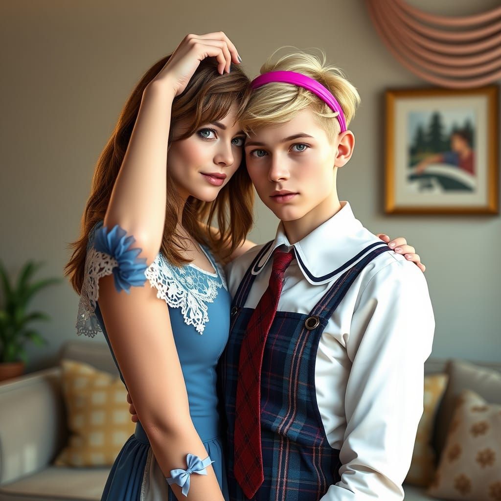 A tender scene of a woman gently placing a pink headband on a cross-dressing young man in a schoolgirl uniform, set in a warm and inviting living room with soft lighting and vibrant colors.