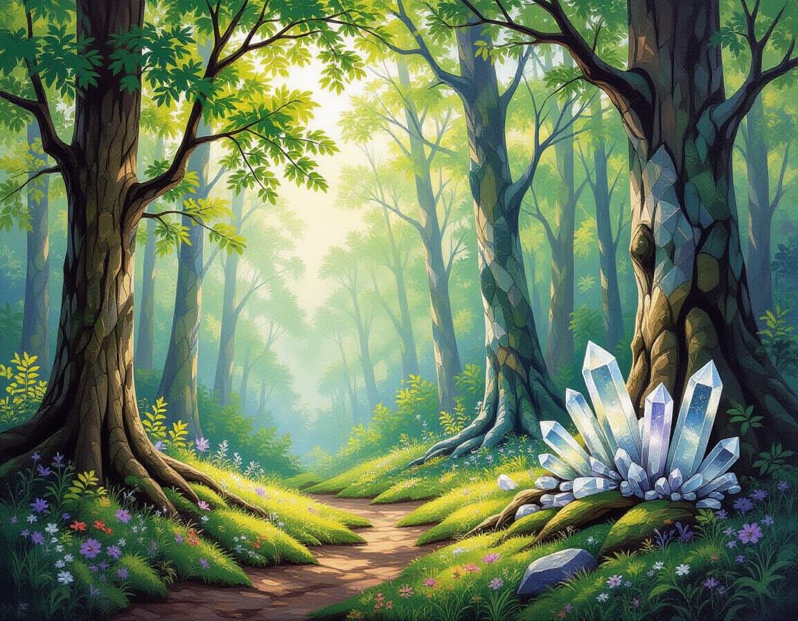 This image shows an enchanted forest transitioning into a crystal cave. The forest transforms from lush woodland to crystalline mineral formations, depicted as an impressionistic oil painting.