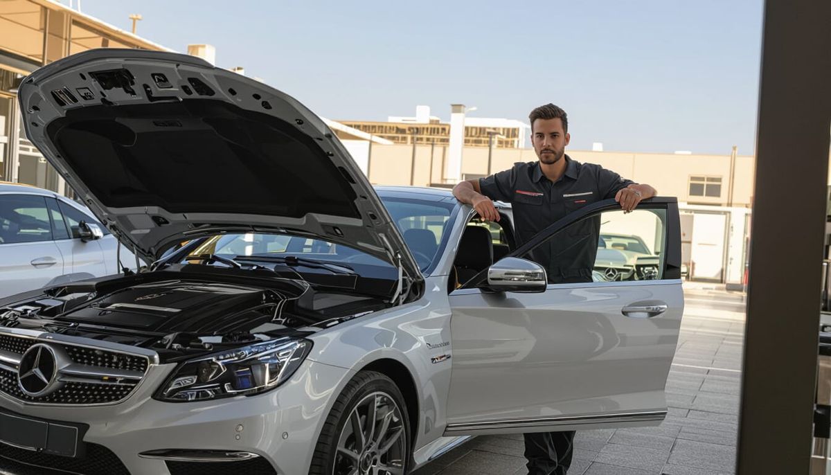 This hyperrealistic image shows a person meticulously working on a Mercedes-Benz in a high-end garage filled with luxury vehicles. Soft, dynamic lighting enhances the scene's polished details and photorealistic quality.