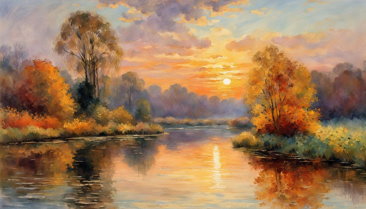 This idyllic landscape painting features a serene sunset over a winding river, with vibrant autumn colors reflecting off the water. Soft brushstrokes and delicate pen outlines create a dreamy, ethereal atmosphere, with warm golden light and subtle texture.