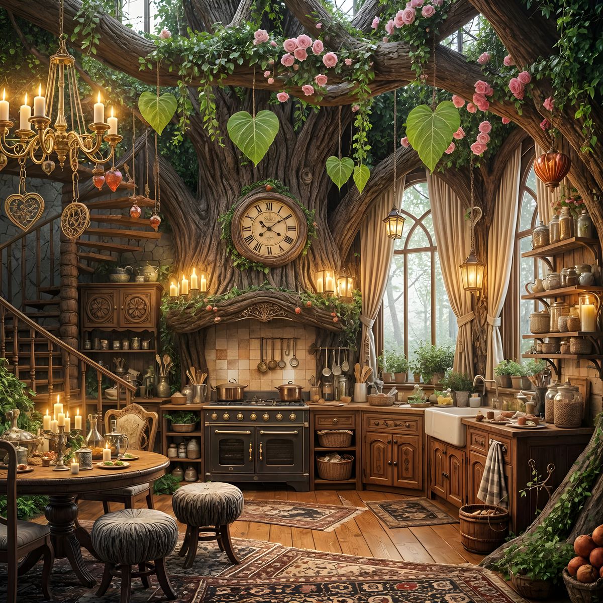 This image showcases a cozy, magical kitchen within an ancient tree trunk, featuring whimsical details, lush greenery, and warm, golden lighting. A fantasy realm brought to life.