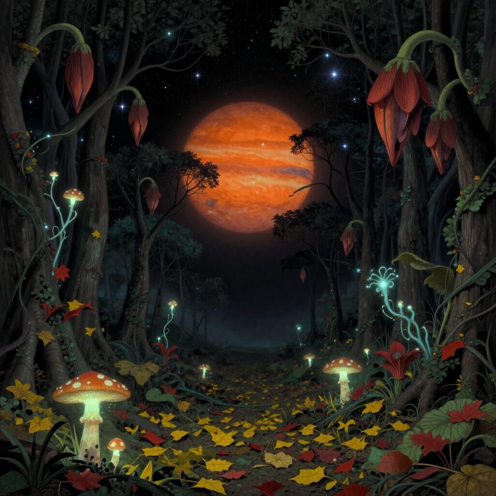 This image shows an alien forest at night, illuminated by bioluminescent flora and a massive gas giant in the sky. It evokes a haunting, ethereal atmosphere with surrealism and dark fantasy elements.