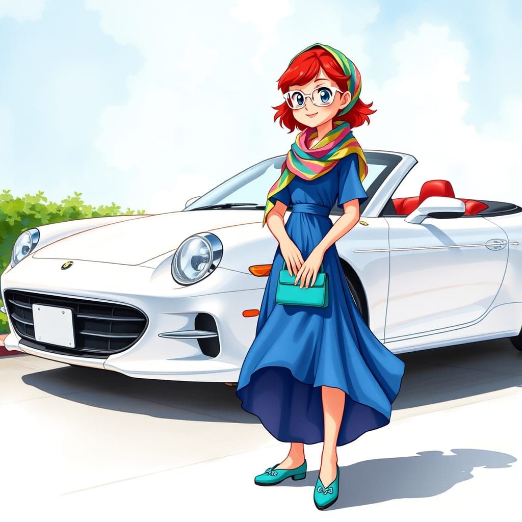 This image shows a girl with red hair, glasses, and a headscarf in a blue dress with a turquoise purse and shoes next to a white convertible. The artwork has a whimsical, watercolor style.