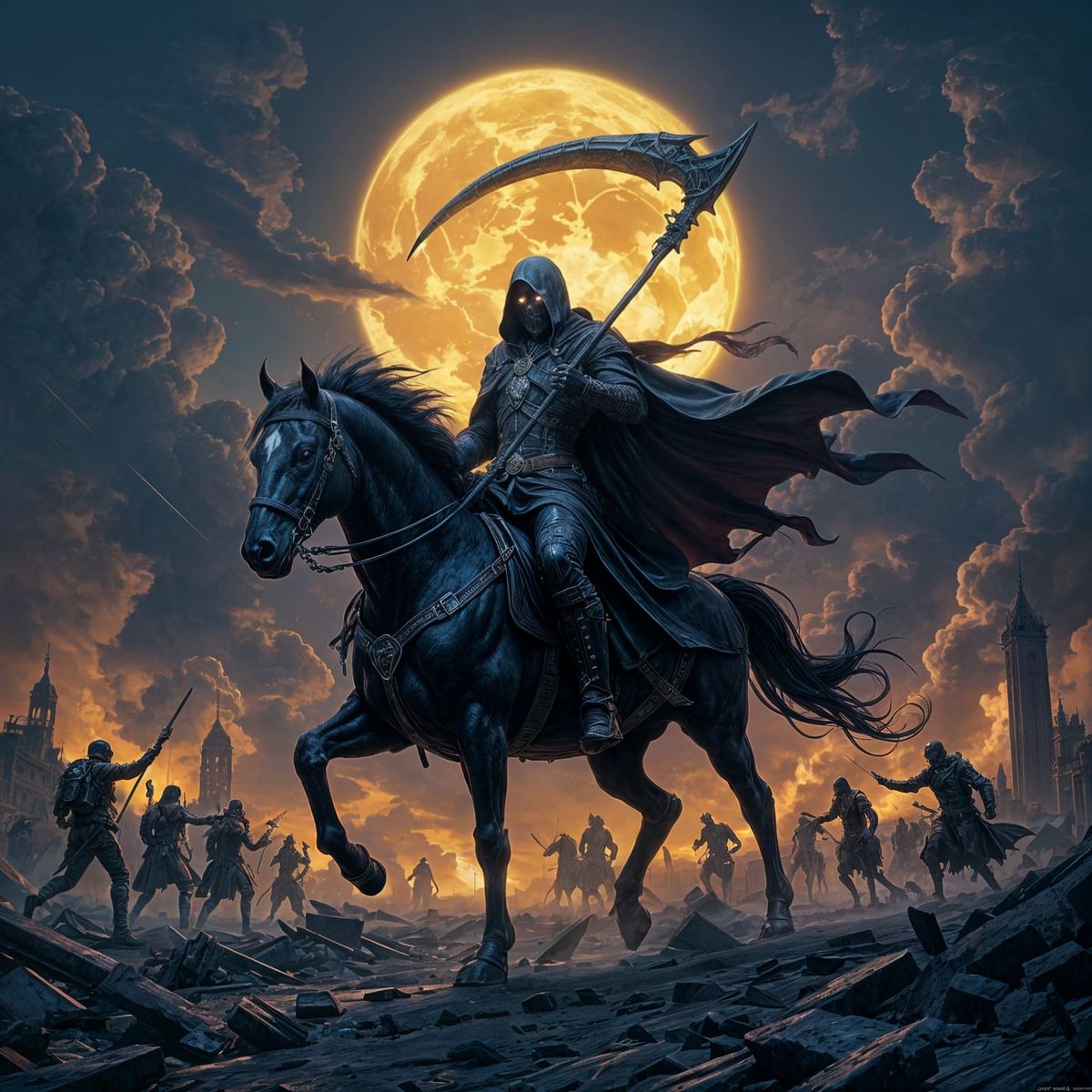 This dark fantasy concept art depicts the Grim Reaper as an apocalyptic horseman, riding a nightmare through a ruined world. Dynamic lighting and deep colors enhance the dramatic scene.