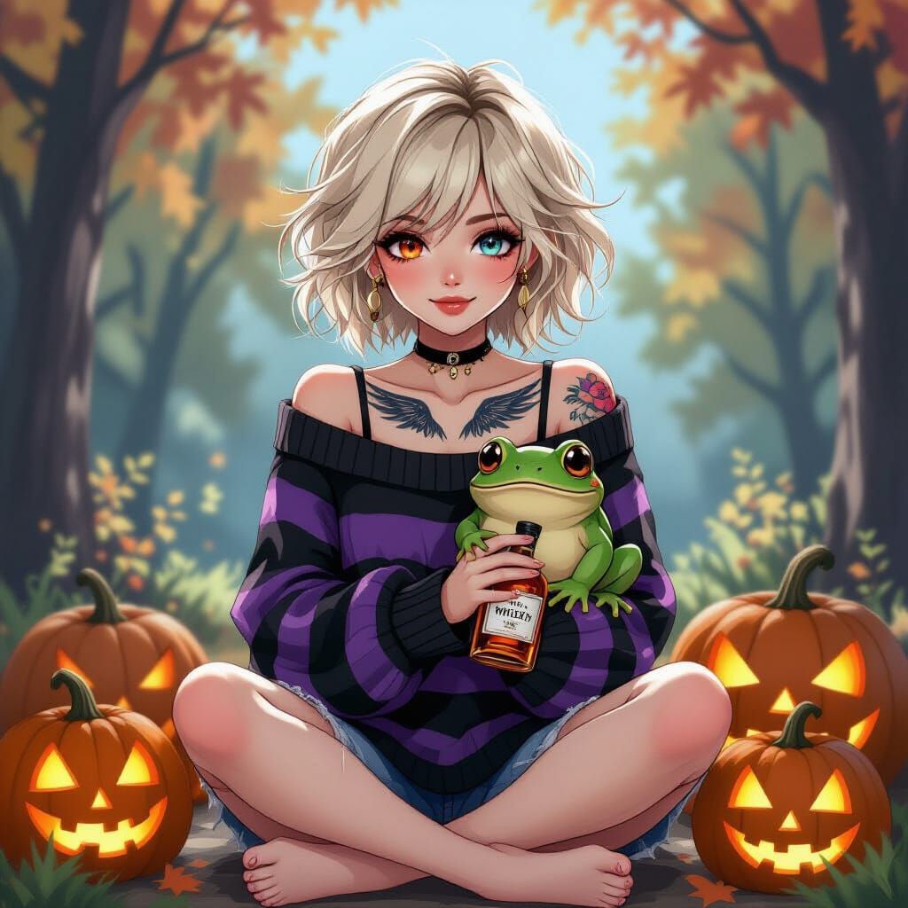 This image showcases a young Emo woman with blond hair, a wing tattoo, and a striped sweater, holding a large frog. Surrounded by pumpkins and whiskey, rendered in a vibrant graffiti and street art style.
