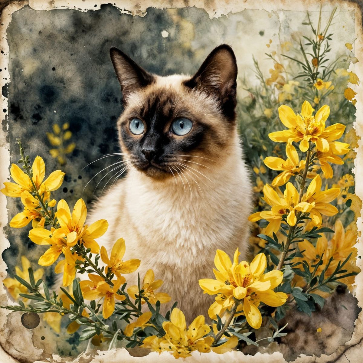 A breathtaking watercolor painting of an exquisite siamese cat with keen eyes and prominent ears, emerging from a field of golden yellow flowers