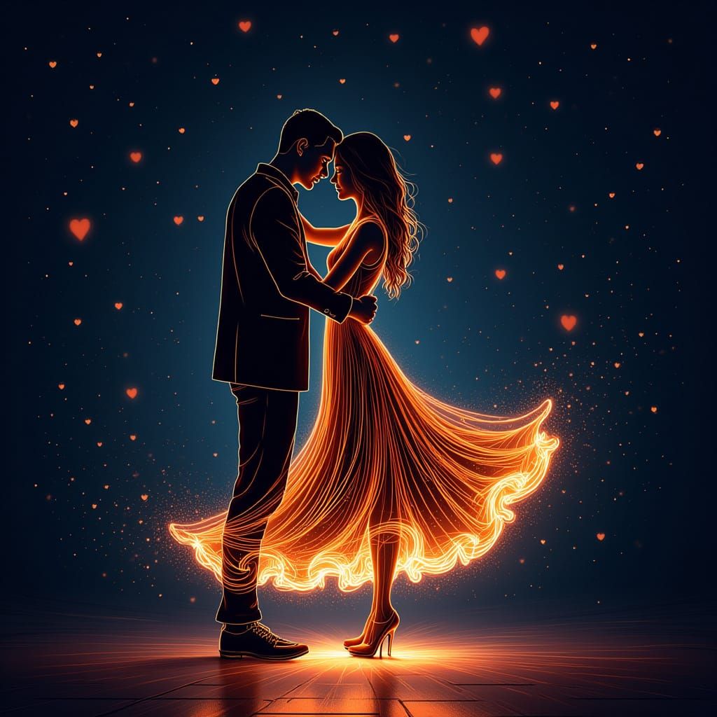 This image depicts a dancing couple rendered in glowing light trails. Soft heart shapes and sparks surround them, with her dress appearing as liquid light.