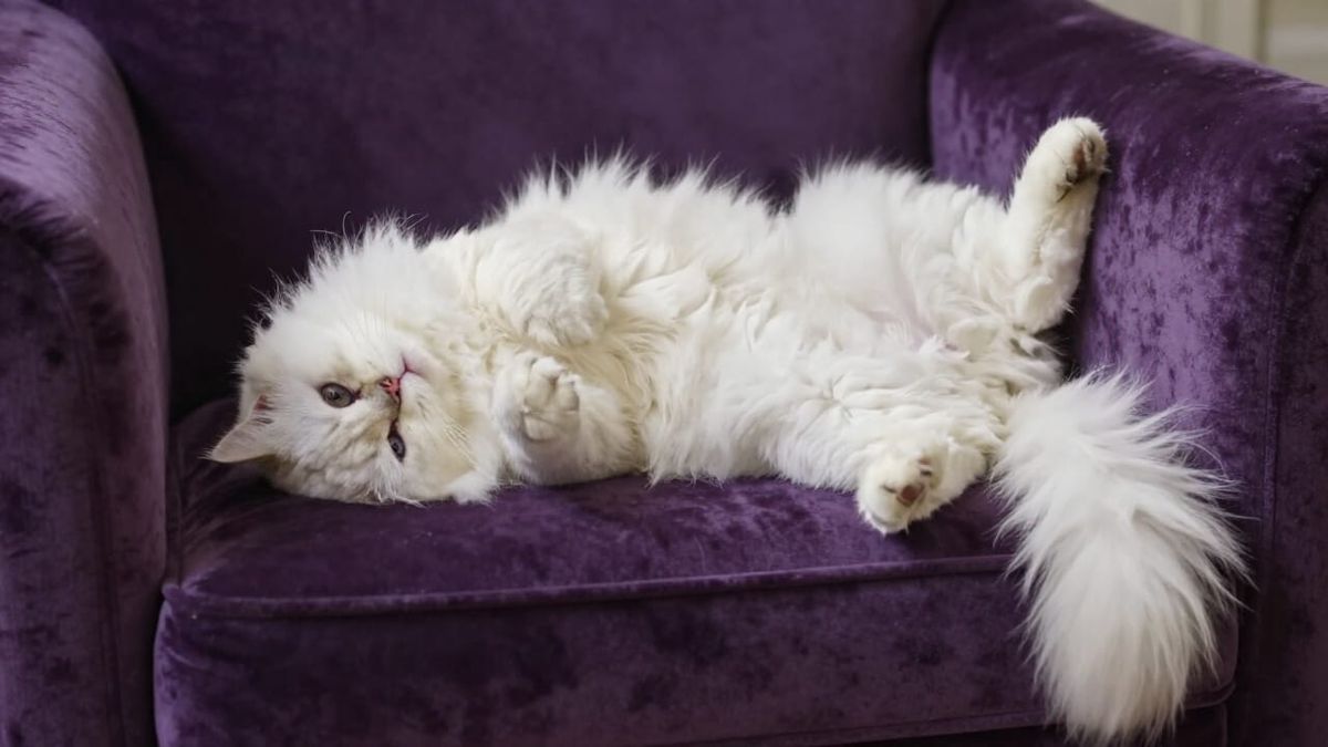 This image shows a fluffy white Persian cat lounging on a purple velvet sofa. Captured with soft lighting and shallow depth of field, it has a whimsical, painterly charm.