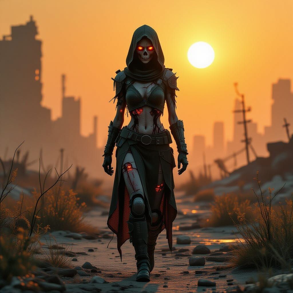 This image shows a hyperrealistic depiction of an energy being woman in scavenged attire, wandering a desolate, overgrown world. Features gritty textures, volumetric lighting, and a cinematic color palette.