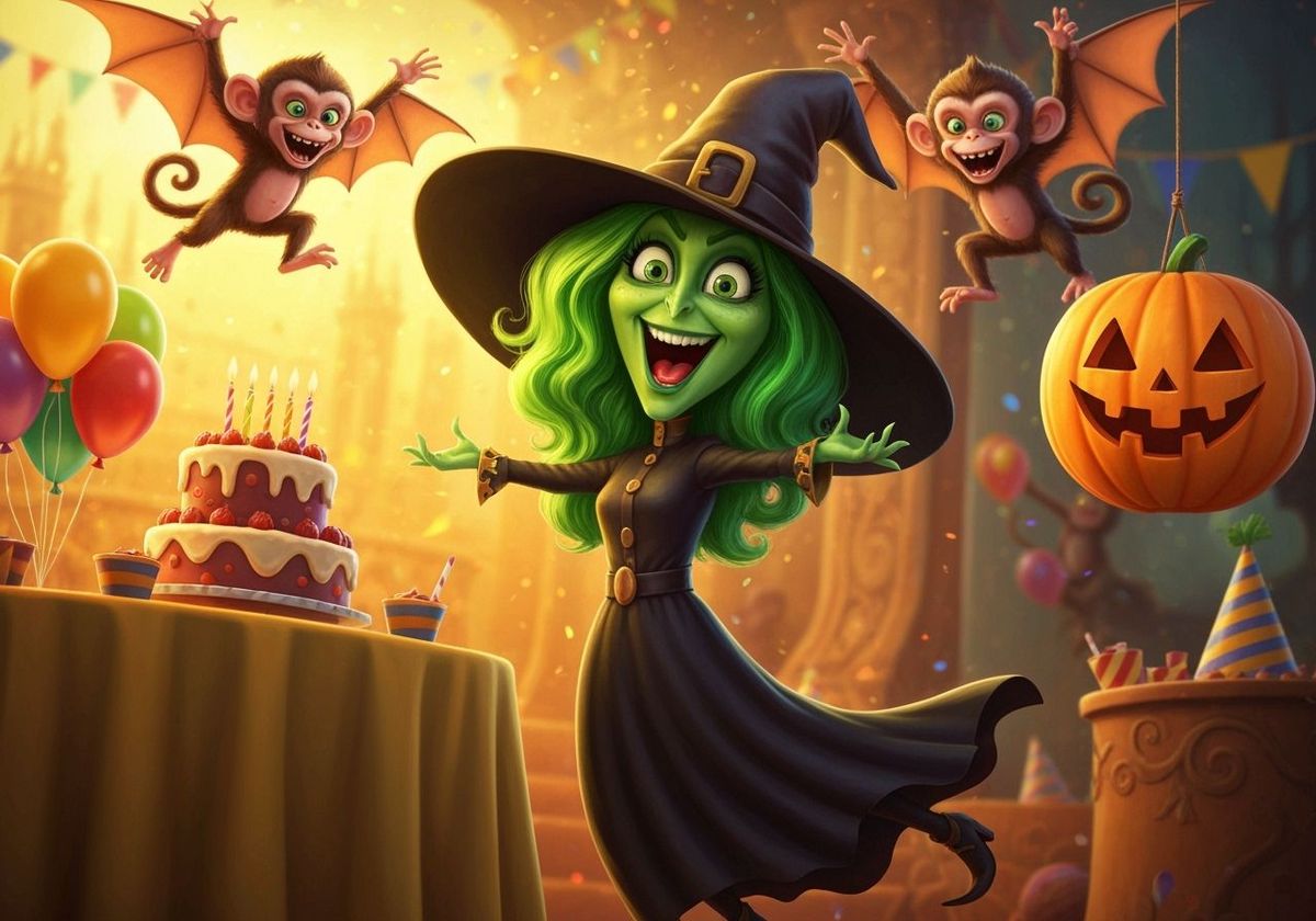 This image shows the Wicked Witch of the West joyfully celebrating a birthday with her flying monkeys. Features a festive green, yellow, orange, and black color scheme with a piñata and balloons, in a whimsical, magical style.