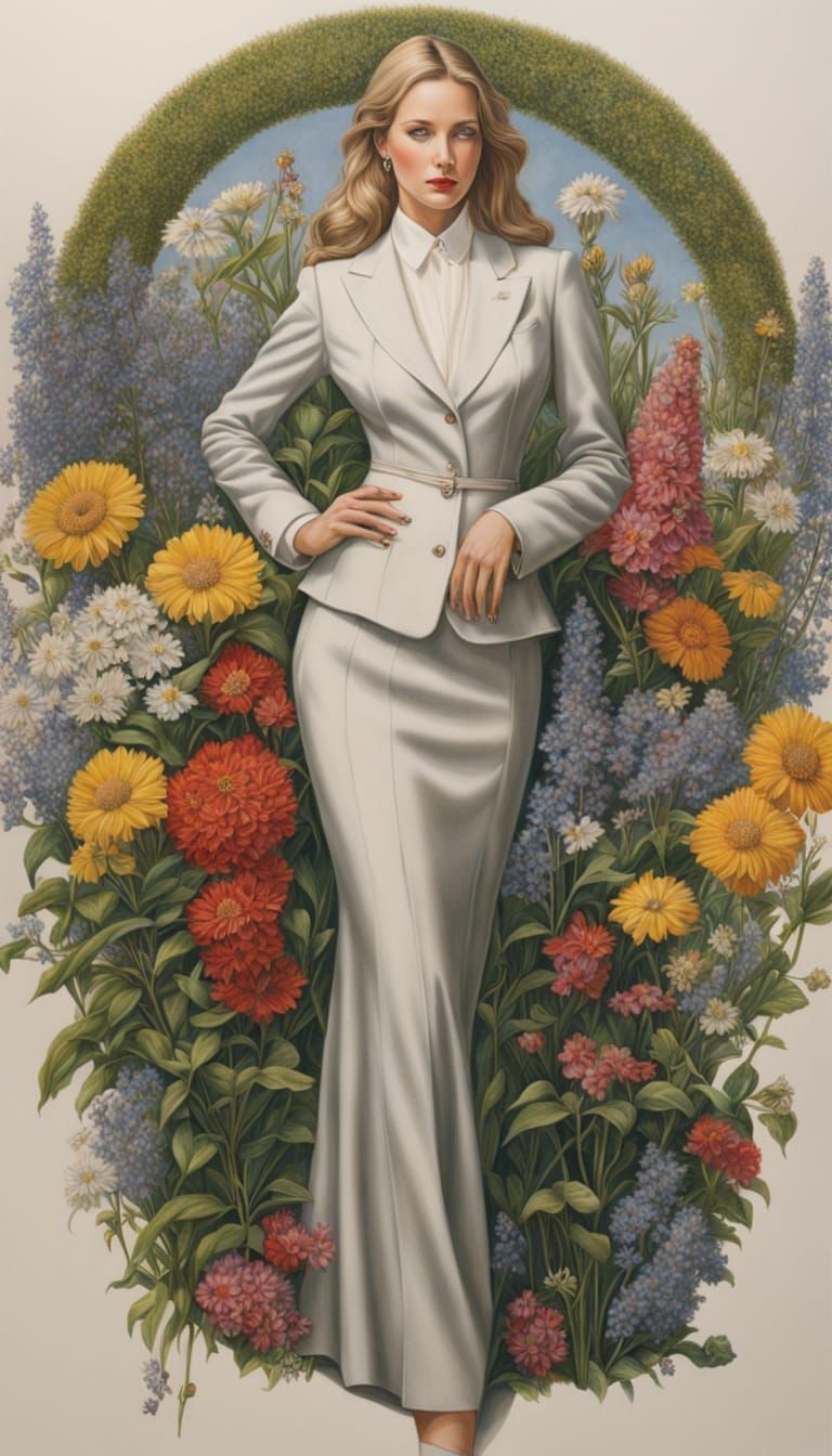 This image shows a woman in a business suit, rendered as a colored pencil drawing. The drawing is highly detailed and depicts the subject surrounded by lobelia flowers.