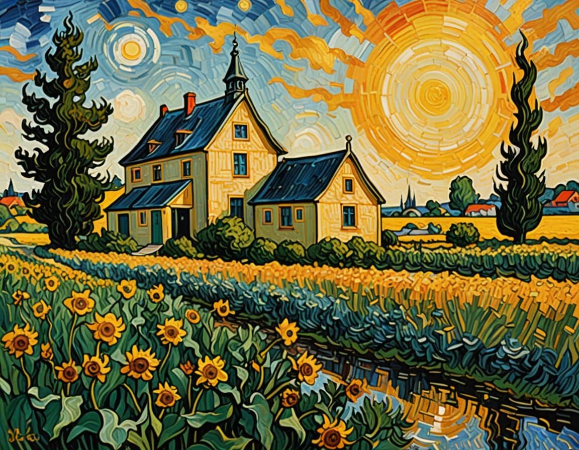 Kubistische raket wordt gelanceerd in een landschap met heuvels, Mankes stijl kale bomen, grote keien, stromende rivier een landhuis, korenvelden en zonnebloemen. Expressionistisch, Wong, dikke penseelstreken, van Gogh, vroeg werk Mondriaan en ondergaande zon