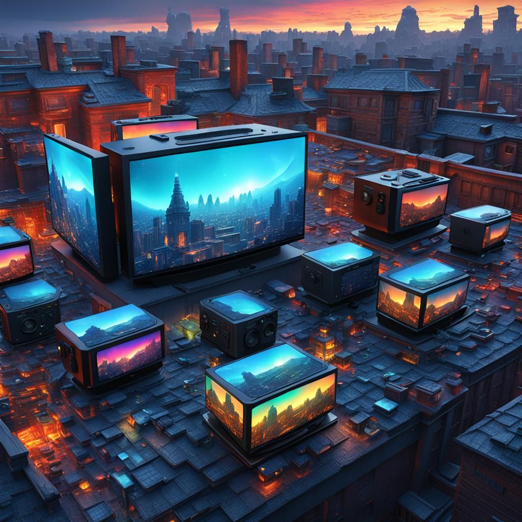A striking picture of mandelbulbs resembling flat screen TVs adorn many rooftops. The screens display glowing hands in various colors. This digital art features deep colors and intricate detail.