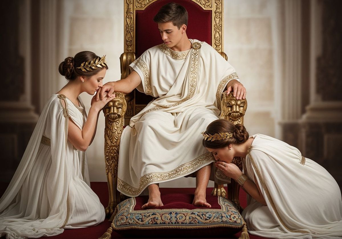 This image shows a young Roman emperor sitting barefoot on a golden throne. He is attended by a princess kissing his hand and an empress kissing his feet, captured with soft, natural lighting.