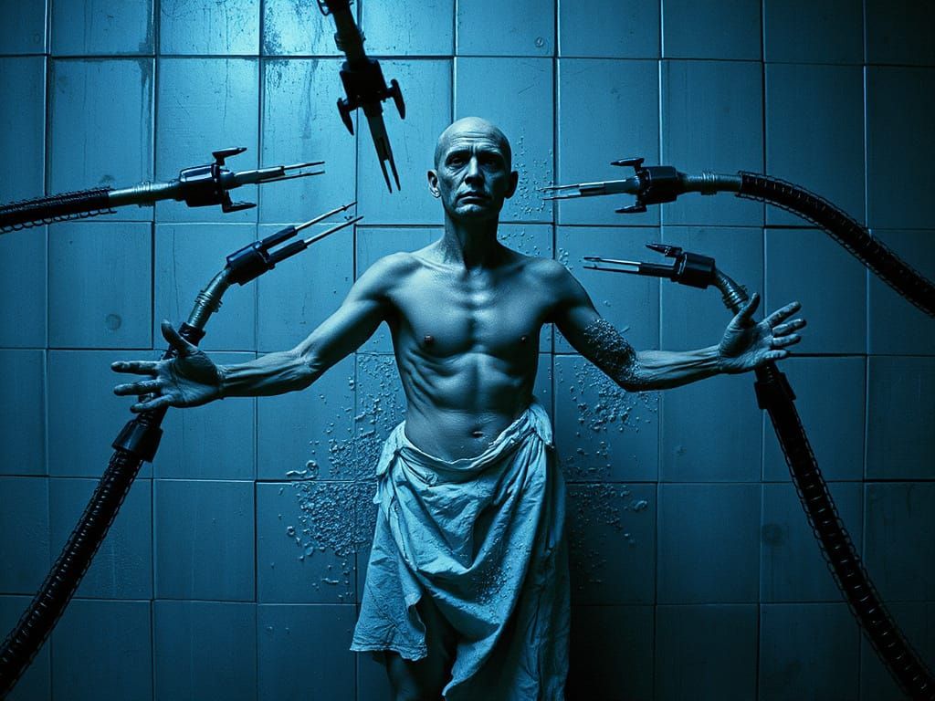This image shows a decaying clone in a lab setting, being dissected by cybernetic tendrils. The scene is depicted in stark shadows and cold colors, reminiscent of dark biomechanical and dystopian art.