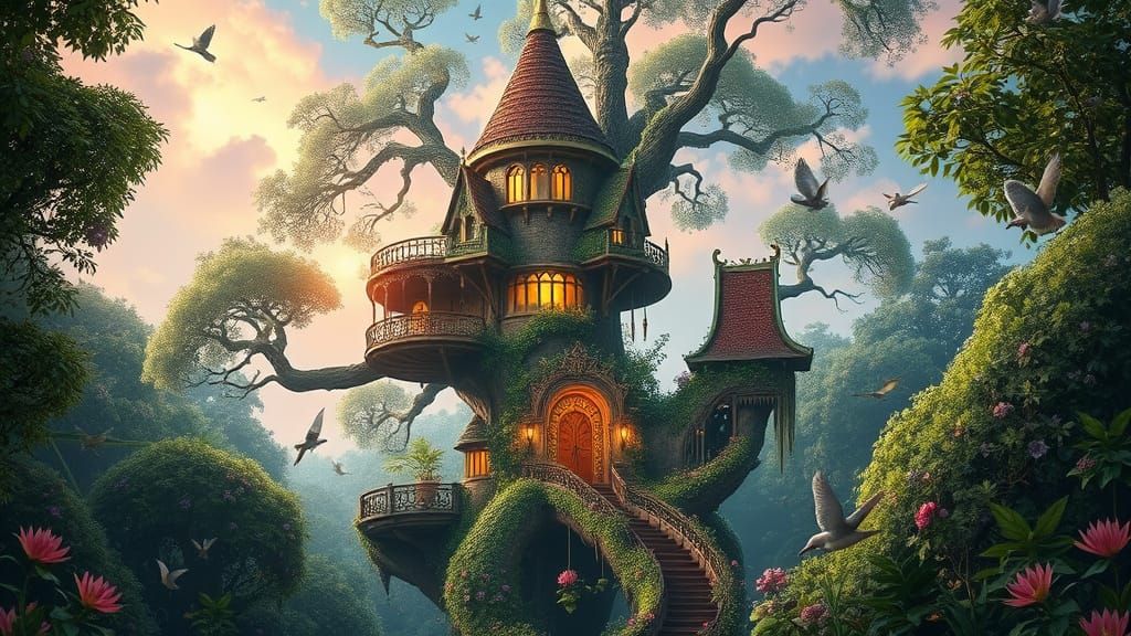 This enchanting image depicts a majestic treehouse castle set amidst a lush, vibrant Garden of Eden, teeming with exotic plants, animals, and birds, against a brilliant pastel-hued sky, with intricate Art Nouveau and Rococo architecture and warm, golden lighting, inviting the viewer to step into a fantas...