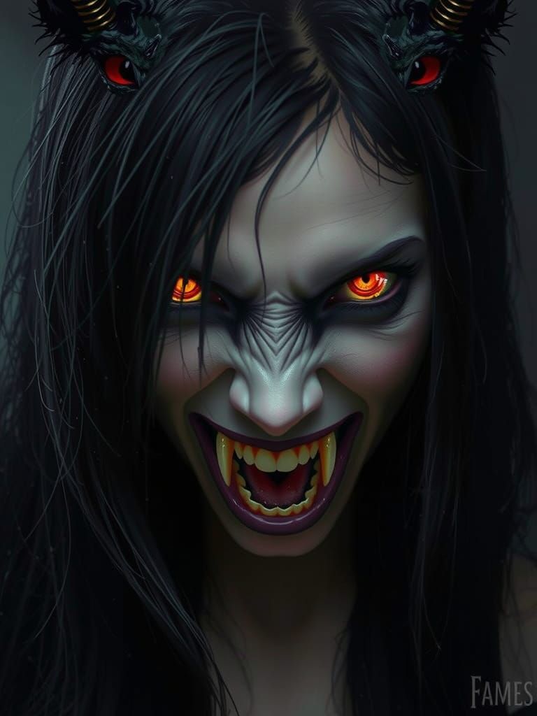 This image shows a dramatic scene of a woman with long black hair and glowing amber eyes, obscured by a snarling black dog's face, surrounded by opulent throne room details in a luxurious palette of silver, red, and gold.