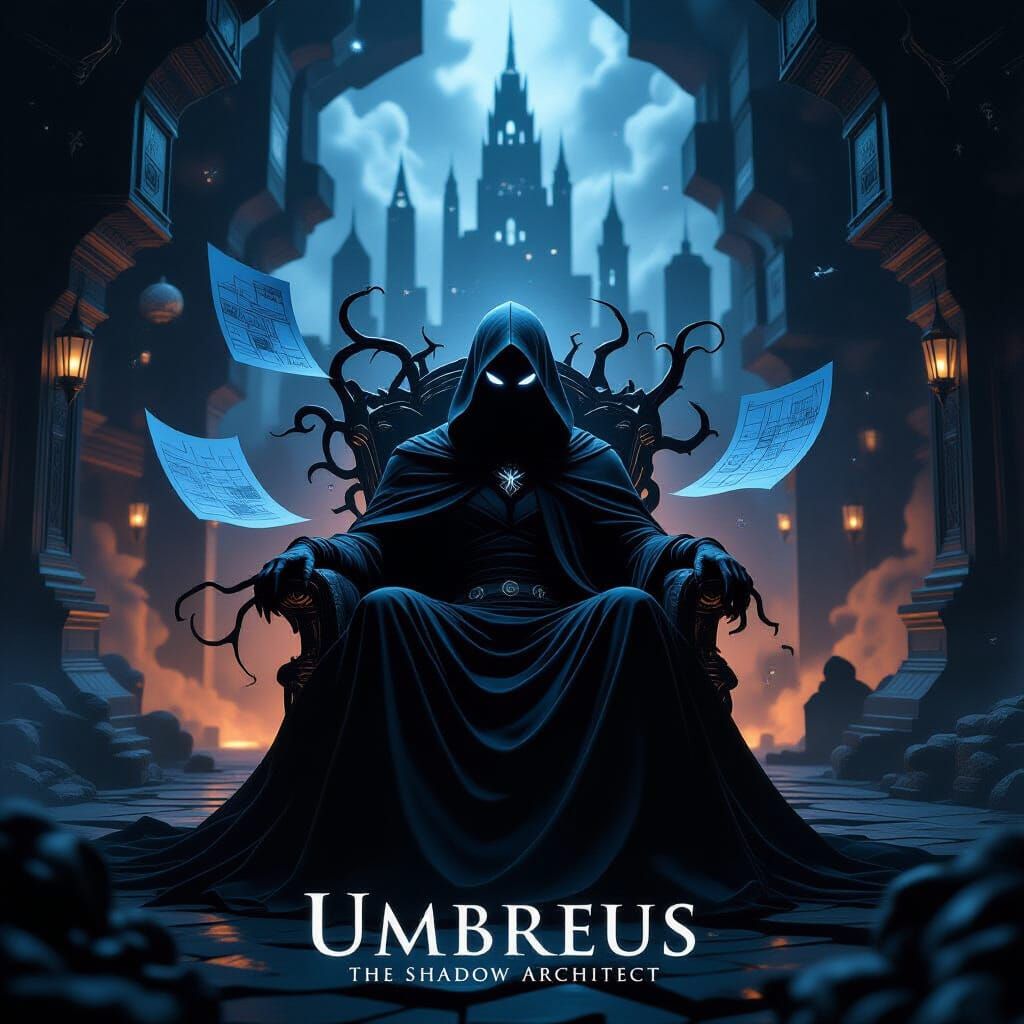 A haunting portrait of a super villain known as the Shadow Architect. The faceless figure commands shadows, sculpting them into buildings and monsters in a dark fantasy style.