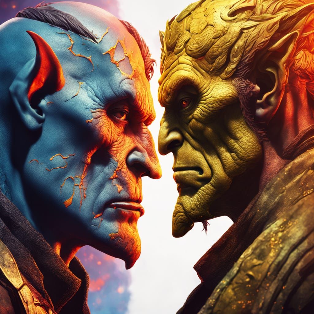 This image shows Hellboy in a tense face-off with a demon elf. The artwork features vibrant, colorful textures, golden side lighting, and intricate details in a splash art style.