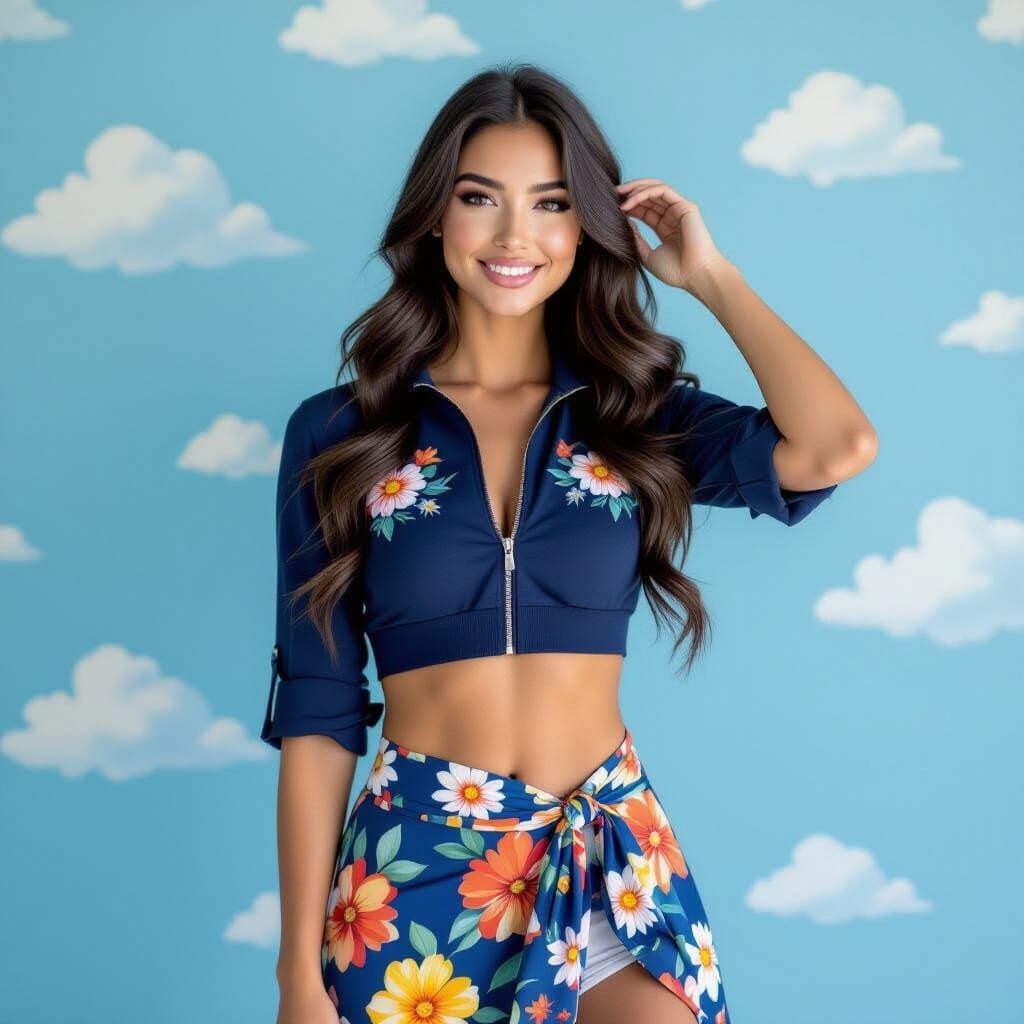 A striking picture of a beautiful woman with long dark hair, posing in a blue floral outfit. The photo showcases soft, natural lighting and vibrant colors, highlighting her radiant smile.