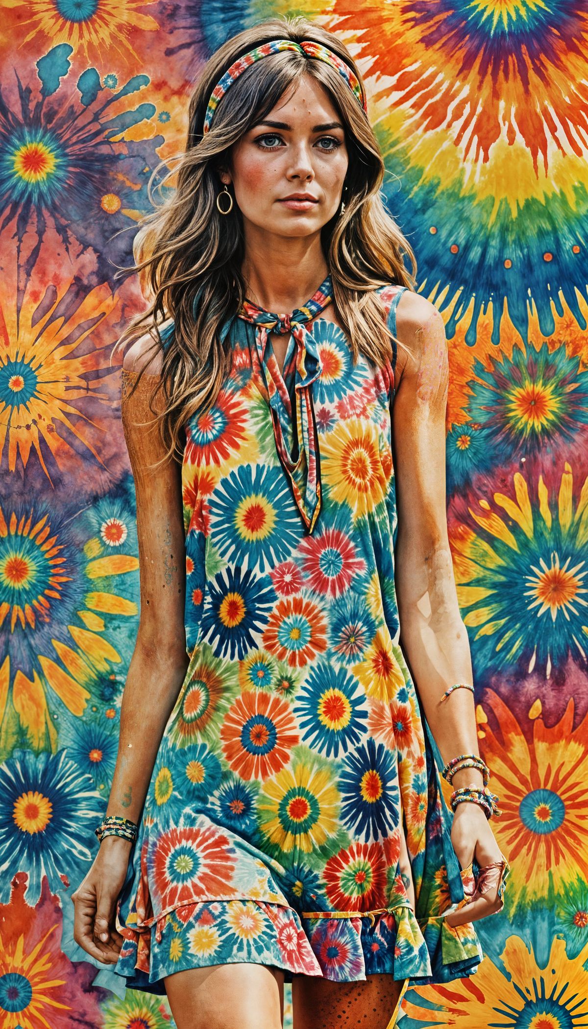 This image shows a watercolor painting of a young woman in a tie-dye minidress, reminiscent of 1960s hippie fashion. The background evokes the Woodstock Music Festival.