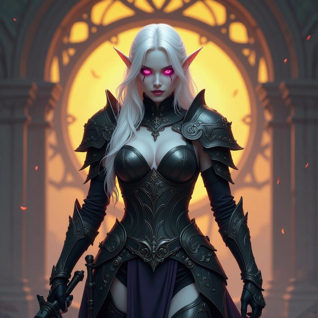 A digital rendering of an albino elf warrior in dark fantasy armor, standing against a dark background. The image features vibrant colors and dynamic lighting, reminiscent of a cinematic film still.