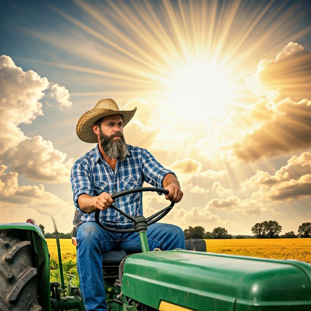 This image shows a shirtless, bearded farmer driving a tractor. Beams of sunlight stream down from the clouds, creating a divine and soft-focused atmosphere.