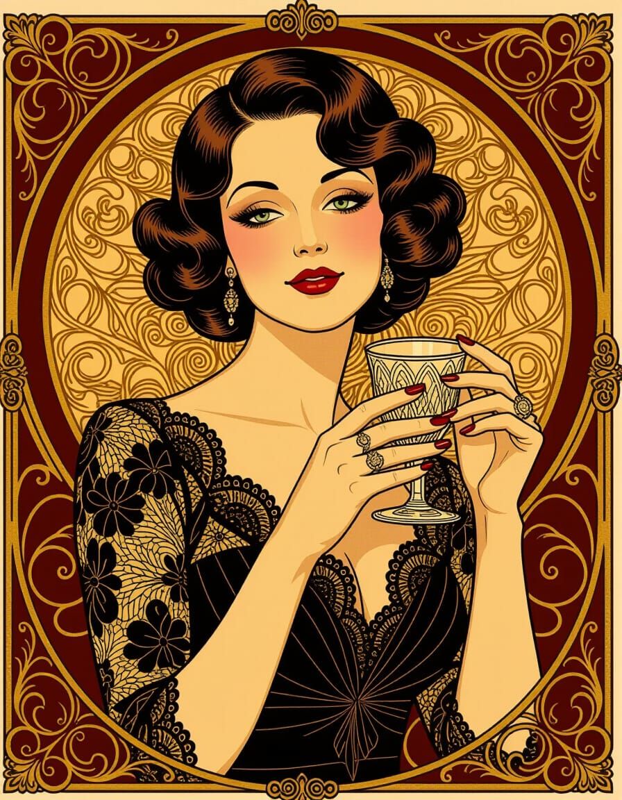 A captivating image of an elegant woman in a lace dress, reminiscent of 1920s pin-up art. The art deco style is emphasized by warm colors and dramatic shading.
