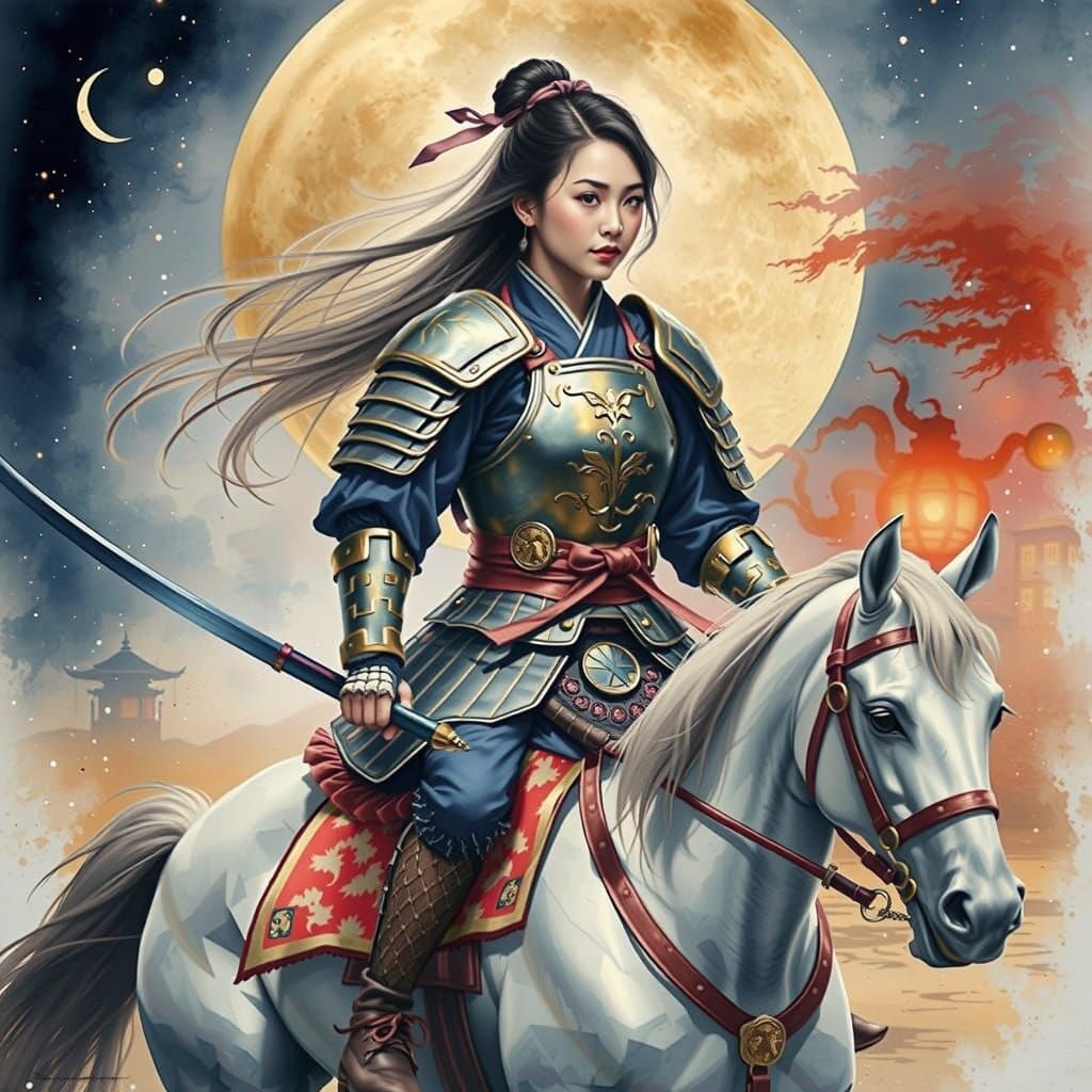 This image shows a female samurai on horseback in a serene Japanese night scene. The artwork is reminiscent of art nouveau blended with futuristic and fantasy elements.