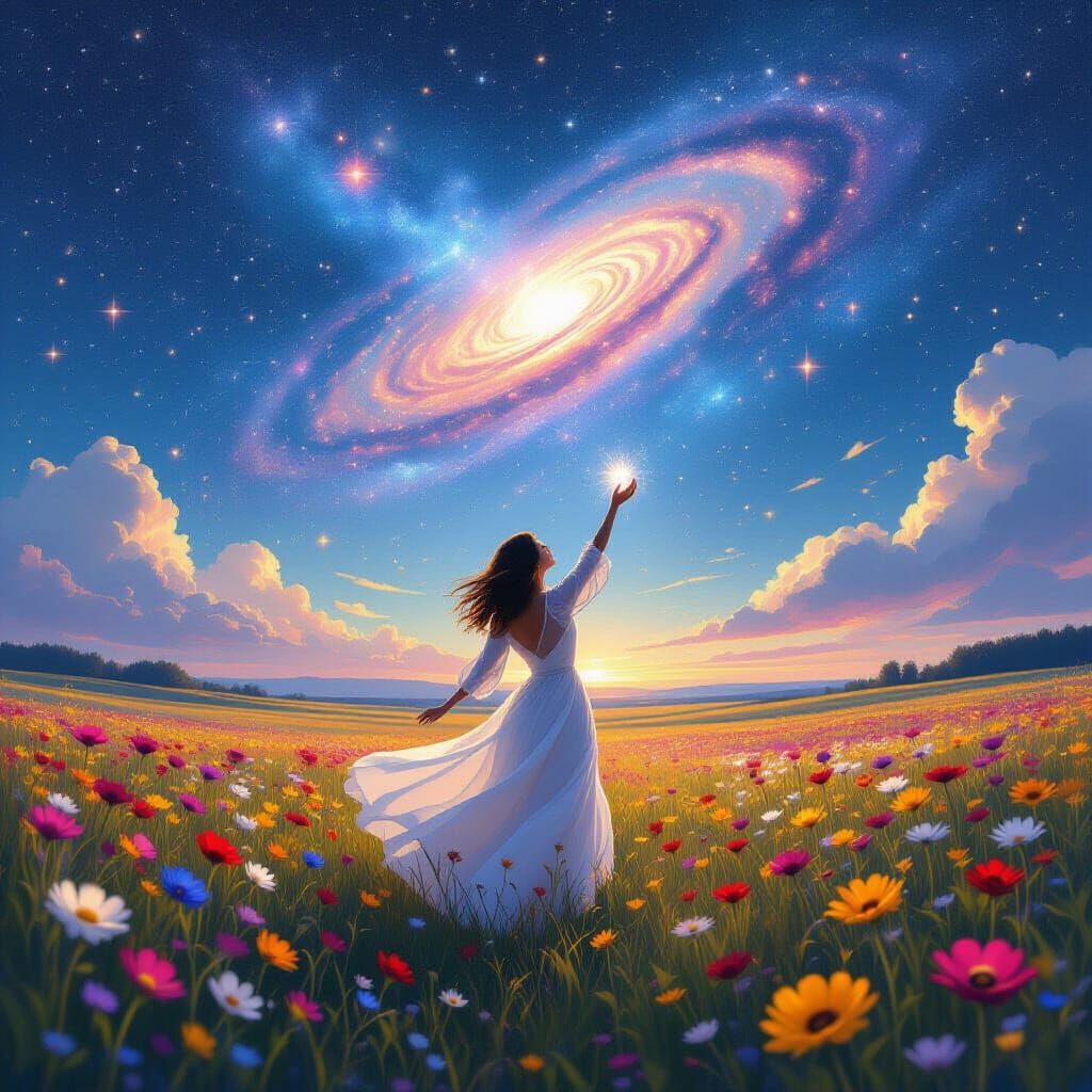 A woman in a flowing white dress stands in a field of wildflowers, looking at a swirling galaxy. The art style features an ethereal glow and cosmic dust.