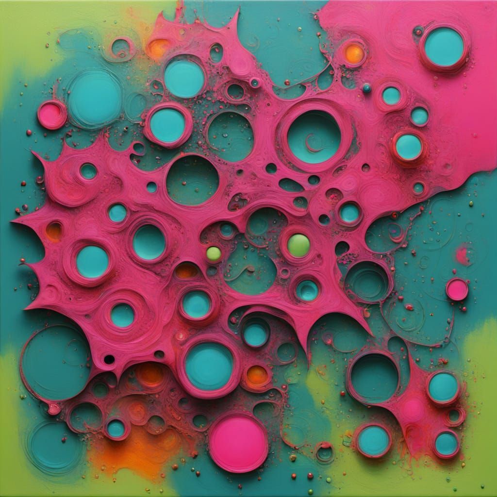 This AI-generated artwork is an abstract surrealist painting featuring a dynamic blend of hot pink, hunter green, and international orange in a cyberpunk style.