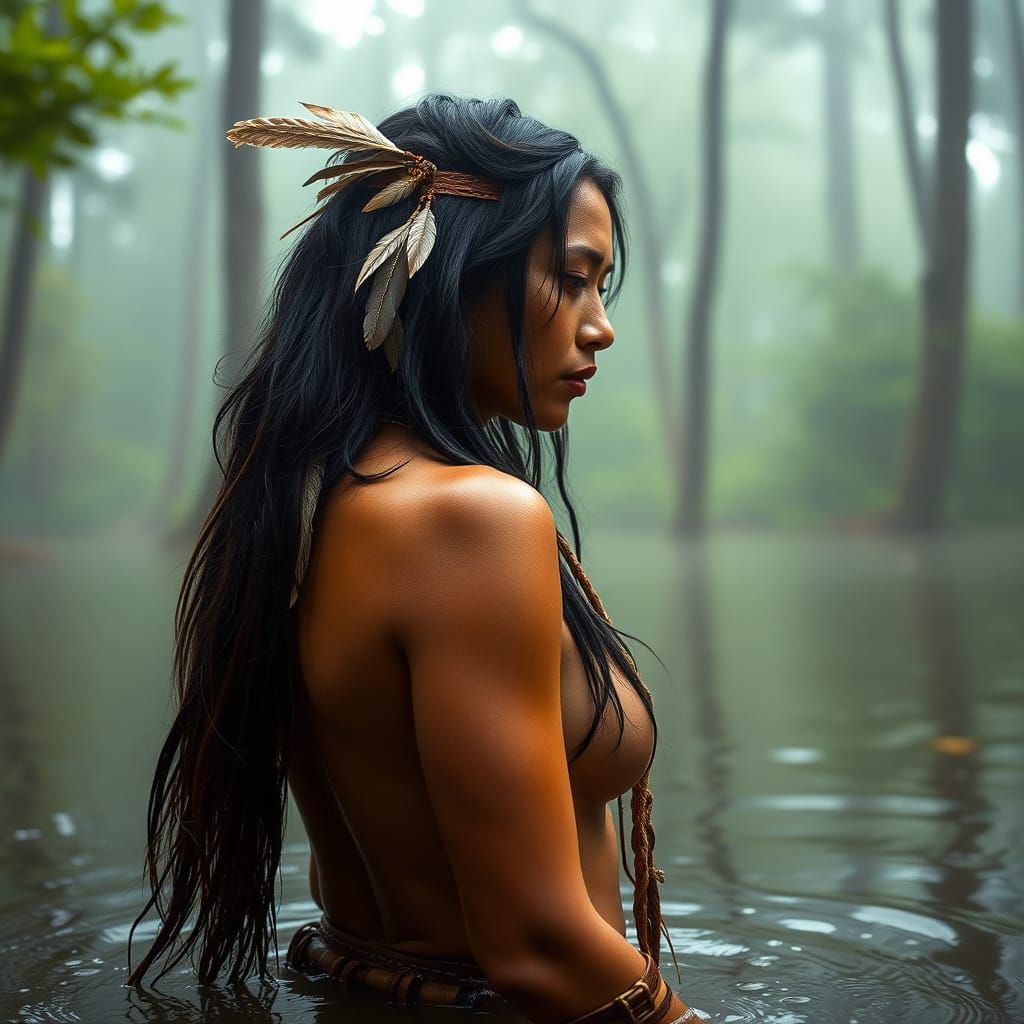 This image shows a serene Choctaw Indian woman surrounded by a misty forest, wading in thigh-high waters with feathers in her dark hair and a leather band on her arm. Shot in a cinematic film still aesthetic with subtle film grain and a rich color grade.