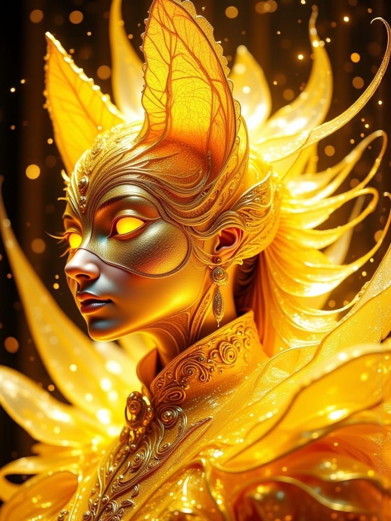 A digital portrait of a metallic cat-woman with luminous hair. The figure wears paper garments in white and yellow, set against a star-filled sky with crystal galaxies, rendered with chiaroscuro lighting.